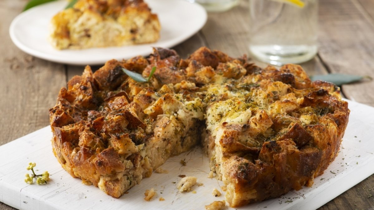 Soğuyan pırasayı, baharatları ve küp doğranmış pideyi ilave edin. Bütün malzemeyi iyice karıştırın. Orta boy yağlanmış fırın kabına dökün. Suyla ıslatılmış kaşığın tersi ile üzerini hafifçe düzeltin. Önceden ısıtılmış 180 derece fırında kızarana kadar pişirin. Üzerine nane serpip servis yapın.