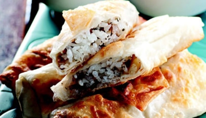 Kıyılmış nane, tarçın, mercanköşk, kuş üzümü, tuz ve karabiber ekleyip karıştırın. Her bir yufkayı 8 üçgen parçaya bölün. Yufkaları düz bir zemine serip, geniş taraflarına naneli karışımı pay edin. Sigara böreği gibi sarıp, kızgın ayçiçek yağda kızartın. Üzerlerine kaşar peyniri serpip servis yapın.