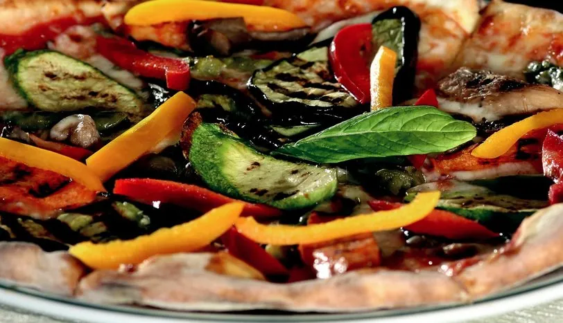 Domates sos için domateslerin kabuklarını soyup küp küp doğrayın. Zeytinyağı ile birlikte bir tencereye alın. Suyunu bırakınca ince kıyılmış fesleğen, kekik ve sarımsakları ekleyin. İyice kaynadıktan sonra ocaktan alıp soğumaya bırakın. Hamur için tüm malzemeyi bir kaba alıp yoğurun. Üzerinin kurumaması için temiz bir bezle örtüp 2 saat dinlendirin. Hamuru un serpilmiş düz bir zemine alın. Kenarlarını hafifçe yükseltip elinizle çevirerek 25 cm çaplı olacak şekilde açın. Üzerine domates sos sürüp parmesan peyniri serpin. Kabak, patlıcan, havuç ve mantarı dilimleyin. Yapışmaz yüzeyli tavada hafifçe pişirin. Kuşkonmazları dilimleyip sotelenmiş sebzelerle birlikte pizzanın üzerine yerleştirin. Önceden ısıtılmış 300 derece fırında hamurun kenarı hafif pembeleşene kadar pişirin. Dilimleyerek servis yapın