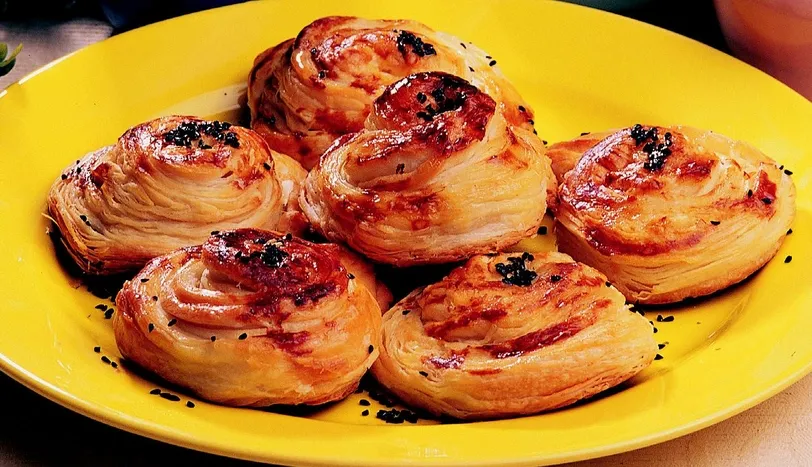 Ilık süte, toz şeker ve mayayı ekleyip karıştırarak kabarmasını bekleyin. Kabardıktan sonra bir kaseye alıp içine sıvı yağ ve tuz ekleyin. Aldığı kadar un ilave ederek kulak memesi yumuşaklığında bir hamur elde edene kadar yoğurun. Hamuru 12 eşit bezeye ayırıp, her bir bezeyi pasta tabağı büyüklüğünde açın. Yumuşamış margarini her bir bezenin üzerine elinizle sürüp üst üste dizin ve tek bir hamur yapın. Hamuru rulo şeklinde sarıp buzdolabında 3 saat dinlendirin. Rulodan 1 parmak kalınlığında hamurlar kesin. Kestiğiniz hamurları iki ucundan çekiştirip incelterek yassı şeritler haline getirin. Şeritleri parmağınıza dolayarak rulo yapın ve yağlanmış fırın tepsisine dizin. Üzerlerine yumurta sarısı sürün. Önceden ısıtılmış 200 derece fırında altı üstü kızarana kadar pişirin. Ilındıktan sonra servis yapın.