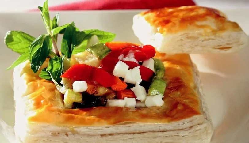 Tüm sebzeleri küp doğrayarak sıvı yağda soteleyin. Sebzeler ılıkken, küp doğradığınız hellim peynirini ilave ederek karıştırın. Fırın tepsisini sıvı yağla yağlayın. 6 adet milföy hamurunu tepsiye dizin. Üzerlerine çırpılmış yumurta akını sürün. Kalan 6 adet milföy hamurunun ortasından, kenarlardan 1,5 cm kalacak şekilde kareler çıkarın. Çerçeveleri tepsideki milföy hamurlarının üzerine yerleştirin. Çerçevelere de çırpılmış yumurta sarısını sürün. 200 derece fırında milföy hamurları pembeleşene kadar pişirip, ılınmaya bırakın. Sebzeli karışımı ortalarına pay ederek servis yapın.