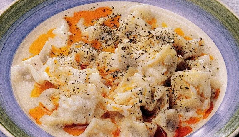 Yoğurdu, su ile karıştırıp, kaynatın. Kaynayınca içine pirinci atın. Kısık ateşte 20 dakika pişirip, mantıları ilave edin. 20 dakika daha pişirin. Diğer bir tavada yağ ile kırmızıbiberi ve naneyi soteleyin. Pişen yemeğin üzerine gezdirip, servis yapın.