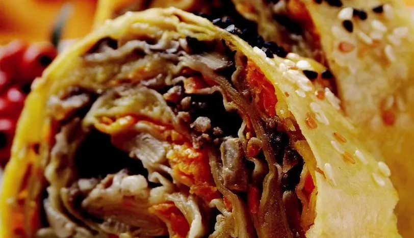 Bir adet soğanı yemeklik doğrayıp, 1/3 su bardağı sıvı yağda hafif soteleyin. Üzerine kıyma ekleyip, sotelemeye devam edin. Tuz, karabiber, dilimlenmiş mantar ilave edip, 2 dakika sonra ocağın altını kapatın. Ayrı bir yerde bir adet soğanı yemeklik doğrayın. Patatesleri küçük küp şeklinde kesin. Soğanı 1/3 su bardağı sıvı yağda hafif soteleyin. Üzerine patates, tuz ve karabiber ilave edip 1-2 dakika sonra ocaktan alın. Havuçları rendeleyin. Kalan 1 adet soğanı yemeklik doğrayın. Ayrı bir yerde, soğanı kalan 1/3 su bardağı sıvı yağda soteleyin. Havucu ekleyip 2 dakika sonra ocaktan alın. İçi için sıvı yağ ve sütü iyice çırpın. Bir adet yufkayı düz bir zemine serin. Üzerine sütlü karışımından sürüp, kıymalı harcı yayın. İkinci yufkayı birinci yufkanın üzerine yerleştirip, sütlü karışımdan sürün ve patatesli harcı yayın. Son yufkayı da aynı şekilde yerleştirip, sütlü karışımdan sürün. Havuçlu harcı yayıp, rulo şeklinde sarın. Fırın tepsisine yerleştirip, üzerine çırpılmış yumurta sarısı sürün. Çörek otu ve susam serpin. Önceden ısıtılmış