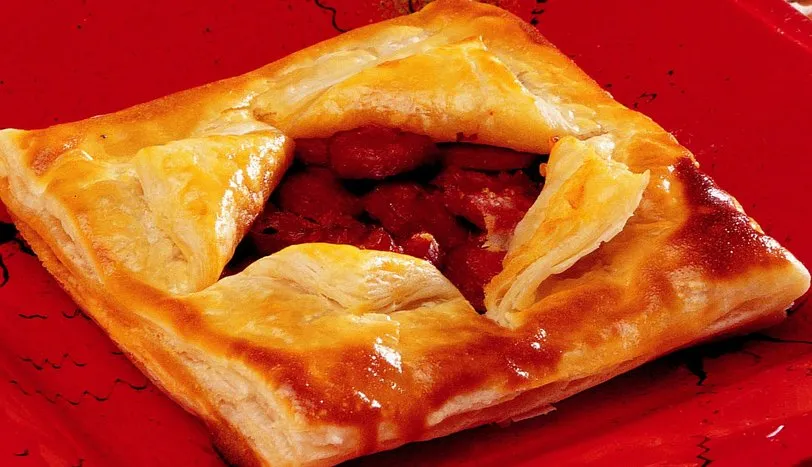 Soğanı yemeklik doğrayıp sıvı yağda kavurun. Halka doğranmış sosisleri, ketçap ve tuzu ekleyip 1-2 dakika soteleyin. Yağlanmış tepsiye 4 adet milföyü yerleştirin. Hazırladığınız karışımı milföylerin ortasına paylaştırın. Üstlerine, kalan milföy hamurlarını yerleştirin. Üstteki hamurların ortalarını (+) şeklinde kesin. Kesik uçları yanlara doğru açın. Yumurta sarısına pekmezi ekleyip karıştırın. Hamurların üzerine bu karışımı sürüp, önceden ısıtılmış 190 derecede fırında pişirin.