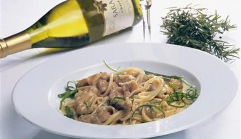 TAVUK etlerini ezilmiş sarmısak, soya sosu, beyaz biber ve nişasta karışımında bekletin. Küçük doğranmış soğanı zeytinyağıyla tavada çevirin. Marine ettiğiniz piliç etlerini ilave edip, soteleyin. Tavuk suyu, taze kekik ve fesleğeni ilave edip, pişirin. Lingunie makarnayı orta dirilikte haşlayıp, bu sos ile karıştırın. Maydanoz ve parmesan peyniri ile süsleyip, servis yapın.