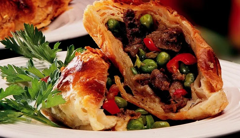 Eti jülyen biçiminde doğrayın. Soğanı da piyazlık doğrayın. Bir tavaya tereyağını alın. Önce etleri kavurun. 10 dakika sonra soğanı atıp, 5 dakika kavurun. Küçük doğranmış biber ve domatesleri ekleyin. Bezelye, tuz ve karabiberi ilave edin. Yarım çay bardağı su ekleyip, tavanın kapağını kapatarak, 15-20 dakika ağır ateşte pişirin. Pişen malzemeleri bir süzgece alıp, sosunu süzün. İnce kıyılmış dereotu ve maydanoz ekleyin. Milföy hamurlarının ortasına etli malzemeden koyup, uçlarını çapraz gelecek şekilde birbirine yapıştırın. Yapıştırdığınız uçlar alta gelecek biçimde yağlanmış fırın tepsisine koyun. Üzerlerine yumurta sarısı sürün. Önceden ısıtılmış 200 derece fırında, üzerleri kızarana dek pişirin.