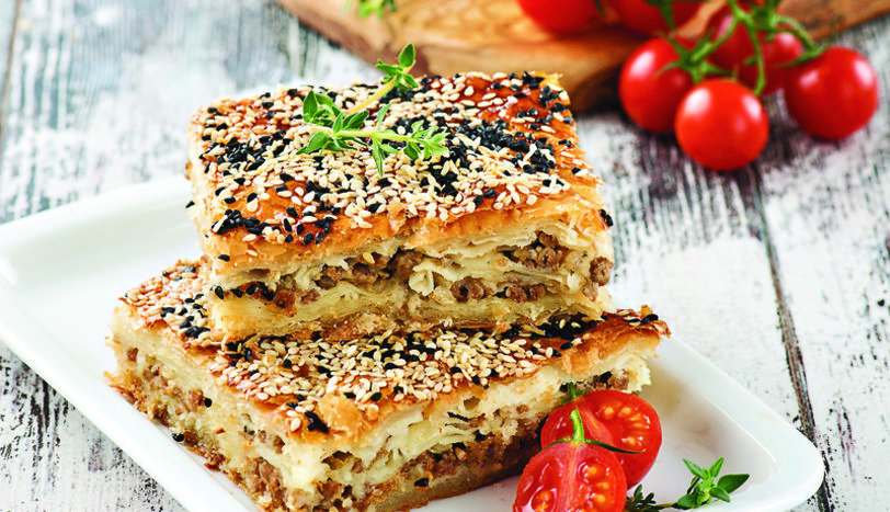Kalan 6 adet milföy hamurunu da daha önce yaptığınız gibi açıp tepsinin en üstüne yerleştirin. Üzerine çırpılmış yumurta sürün. Çörek otu ve susam serpin. Önceden ısıtılmış 200 derece fırında üzeri kızarana kadar pişirin. 10 dakika dinlendirdikten sonra dilimleyerek servis yapın.