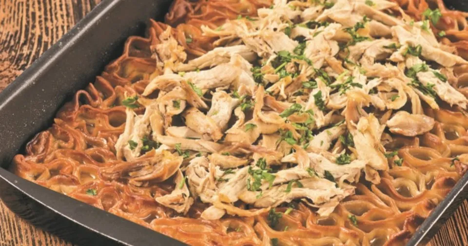 Temizlenmiş tavuğu yıkayıp tencereye yerleştirin. Üzerini dört parmak geçecek kadar su ilave edip, haşlamaya bırakın. Kaynamaya başlayınca tuz ilave edip, yumuşayana dek haşlayın. Hamur için un, tuz, yumurta, süt ve zeytinyağını iyice yoğurup, 3 bezeye ayırın. Her bir bezeyi merdane yardımıyla hafif unlu zeminde çok ince olmayacak şekilde açın. Önce 3 parmak genişliğinde şeritler halinde kesin. Sonra şeritleri enlemesine 4 parmak genişliğinde kesip dikdörtgenler elde edin. Hamurların kısa uçlarını karşılıklı olarak birleştirip, ortası boş ve iki ucu birleşmiş hamurlar elde edin. Yağlanmış orta boy fırın tepsisine yan yana yerleştirin. Önceden ısıtılmış 180 derece fırında kızarana dek pişirin. Fırından alıp, soğuk tavuk suyunu sıcak mantının üzerini 1 parmak geçecek kadar dökün. Tavuğu didikleyip mantının ortasına yerleştirin ve yeniden fırına verip, önceden ısıtılmış 180 derece fırında hamurlar yumuşayana dek pişirin. Üzeri için tereyağını sos tenceresine alıp eritin. Toz kırmızıbiber ekleyip birkaç saniye karıştırın. Mantının üzerine gezdirip servis yapın.