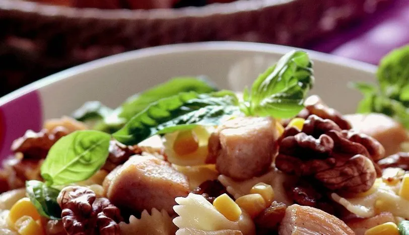 eklediğiniz bol suda paketin üzerinde önerilen süre kadar haşlayıp süzün. Geniş bir kaba alıp, kremayla karıştırın. Üzerine tavuk, mısır, kuruüzüm, ceviz ve tuzu ekleyip, makarna ile harmanlayın. Fesleğen yaprakları ile süsleyerek servis yapın.