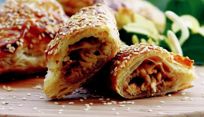 Tavuk etini uzun şeritler halinde doğrayın. Domatesin kabuklarını soyup küp doğrayın. Zeytinyağını bir tavaya alıp tavukları 2 dakika kavurun. Üzerine ince kıyılmış soğan, sivri biber ve domates ilave edin. Tuzunu ayarlayın. 5 dakika harlı ateşte pişirip ocaktan alın. Oda sıcaklığında 5 dakika bekletilmiş milföy hamurlarının içine harcı paylaştırın. Üçgen şeklinde katlayıp kenarlarına hafifçe bastırın. Üzerlerine çırpılmış yumurta sarısı sürüp, susam serpin. Önceden ısıtılmış 200 derece fırında 20-25 dakika pişirip servis yapın.