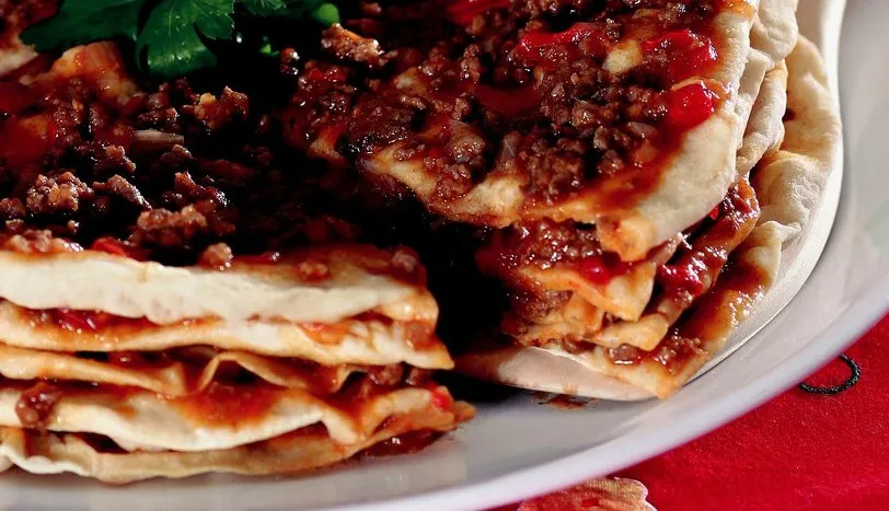 Unu derin bir kaseye eleyip ortasını havuz şeklinde açın. 1 çay kaşığı toz şeker ve tuzlu ılık suda mayayı eritip unun ortasına dökün. Yeterince su ilave edip yumuşak bir hamur elde edene kadar yoğurun. Hamurun üzerini nemli bir bezle örterek oda sıcaklığında 15 dakika bekletin. Ceviz büyüklüğünde parçalar koparıp ince olacak şekilde pasta tabağı büyüklüğünde açın. Açtığınız hamurları sacta veya yapışmaz yüzeyli bir tavada arkalı önlü kızartın. Yumuşak kalması için bir bez örtünün arasına sarın. Diğer tarafta tereyağında yemeklik doğranmış soğan ve kıymayı kavurun. İnce kıyılmış kırmızı ve sivri biberi ilave edip kavurmaya devam edin. Küp doğranmış domates, kesme şeker, tuz, karabiber ve pul biberi ekleyip domatesler yumuşayana kadar pişirin. 1 su bardağı suyun içinde salçayı açıp iç harca ekleyip 1-2 dakika kaynatın. Lavaş ekmeklerinin ilkini servis tabağına alın ve üzerine iç harçtan serpin. Üzerine ikinci lavaş ekmeğini yerleştirin ve üzerine iç harçtan serpin. 5 sıra olacak şekilde aynı işleme devam edin. Lavaş ekmekleri bitene kadar aynı işlemi uygulayın. Daha sonra üst üste dizilmiş yağlamaları 4 parçaya bölün. Sarımsaklı yoğurtla birlikte servis yapın