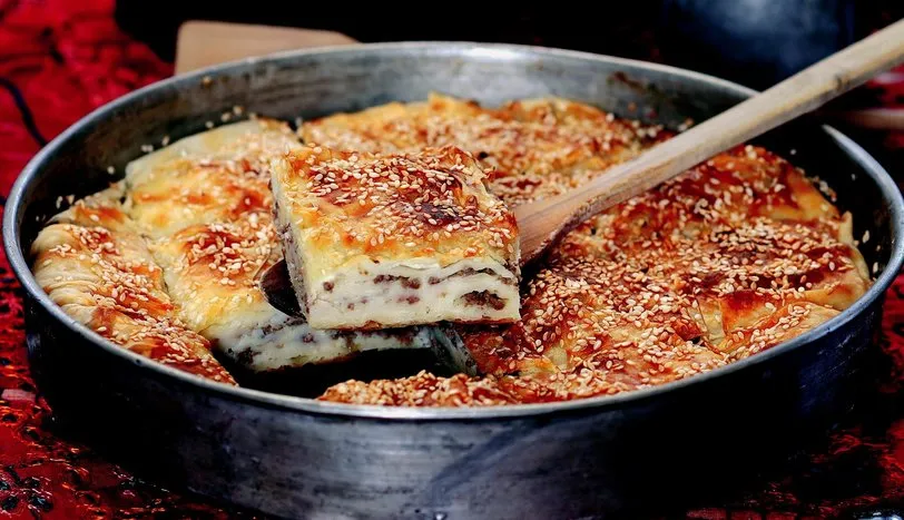 Yoğurt, yumurta ve yağı birlikte çırpıp kenara alın. Soğanı yemeklik doğrayıp kıyma ile birlikte kavurun. Tuz ve karabiber ekleyin. Bir fırın tepsisini yağlayıp yufkalardan birini kenarları dışarı taşacak şekilde içine yerleştirin üzerine yoğurtlu karışımdan dökün. Kalan yufkaları iri parçalara bölün. Yufkalar yarılanana kadar bir yoğurt- bir yufka olmak üzere bu işlemi tekrar edin. Yarılanınca ortaya kıymalı karışımı dökün ve kalan yufkaları da bitirin ve tepsinin kenarından sarkan yufkaları ortaya toplayın. Üzerine yoğurtlu karışımdan dökün ve susam serpin. Önceden ısıtılmış 200 derecelik fırında üzeri kızarana kadar pişirin.