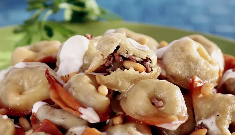 Düz bir zemine koyduğunuz unun ortasını açıp yumurtaları kırın. Tuzunu da ekledikten sonra azar azar ılık su ekleyerek sertçe bir hamur hazırlayın. Üzerini nemli bir bezle örterek 10-15 dakika dinlenmeye bırakın. İç harcı için, sıvıyağı kızdırıp dolmalık fıstıkları pembeleşene kadar kavurun. Üzerine kıymayı ekleyip kavurmaya devam edin. Tuz, karabiber ve naneyi ilave ederek ocaktan alın. Hamuru bezelere ayırıp açın. Çok küçük olmayacak kareler halinde kesin. Ortasına harç koyarak üçgen şeklinde kapatın. Üçgenin iki ucunu, yandaki aşamalarda olduğu gibi birleştirip, uç kısmını geriye doğru çevirin. Hazırladığınız mantıları yağlanmış bir fırın tepsisine yerleştirin. Önceden ısıtılmış 180 derece fırında üzerleri kızarana kadar pişirin. Fırından çıkarıp soğutun. Daha sonra tuzlu kaynar suda 1-2 taşım kaynatıp süzün. Yeniden fırın tepsisine alın. Önceden ısıtılmış 180 derece fırında 5 dakika pişirip arzunuza göre yoğurtla ya da sade olarak servis yapın.