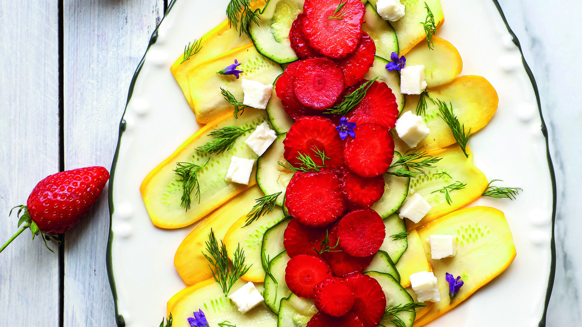 İncecik dilimlenmiş kabakların taze çileklerle buluştuğu bu hafif carpaccio, yaz sofralarına ferah ve şık bir dokunuş katıyor.