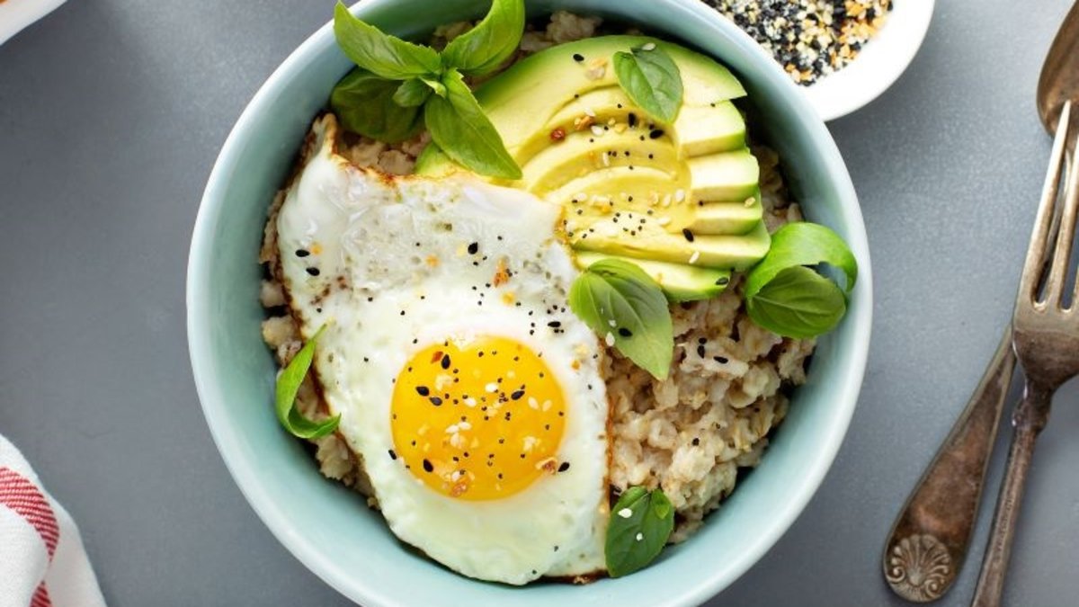 Bir tavaya 1-2 damla zeytinyağı damlatıp, yumurtayı kırarak 3-4 dakika pişirin ve kaseye ekleyin. Yarım ay şeklinde dilimlenmiş avokado ve taze fesleğen yapraklarını da ilave edin. Üzerlerine susam ve keten tohumu serpiştirip servis yapın.