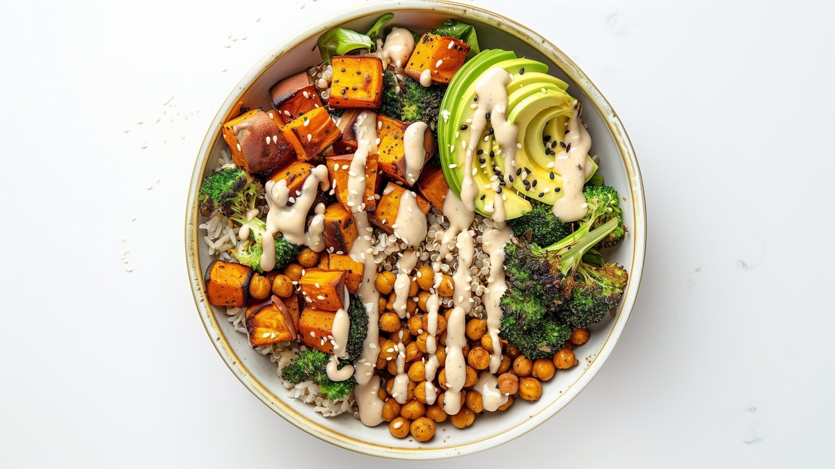 Servis kaselerine önce haşlanmış kahverengi pirinç veya kinoayı paylaştırın. Üzerine fırınlanmış tatlı patates küplerini, nohutları ve brokoliyi yerleştirin. Avokado dilimlerini de ekleyin.
