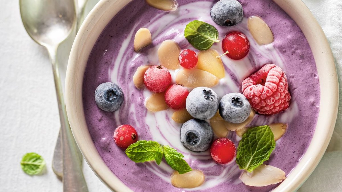 Üzerini yaban mersini, ahududu, frenk üzümü, badem ve nane yaprakları ile süsleyerek servis yapın.AŞÇININ NOTUKarışımın yoğun olması için az miktarda süt ekleyerek başlayın ve gerekirse daha fazla süt ekleyin.