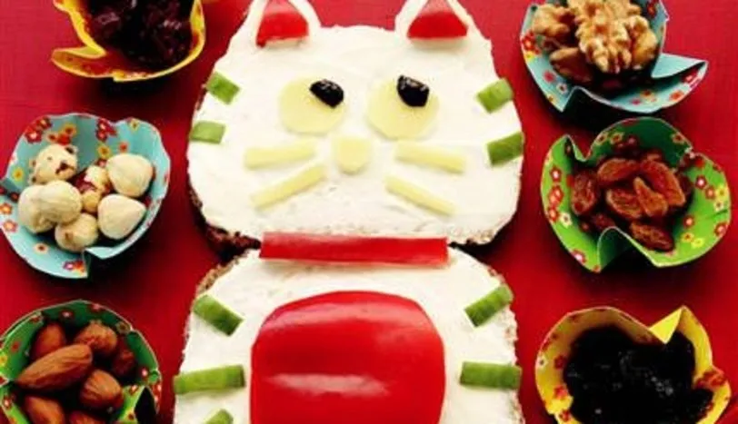 Öncelikle kedi yapmak için bir dilim ekmeği kedimizin kafası olarak kullanacağız. Bunun için ekmeğin üst kısmından kedi için kulak kesin. Gövde bütün bir dilimden oluşacak. Üzerlerine krem beyaz peynir sürün. Kaşar peynirinden burun, gözler ve bıyığı yapın. Göz olarak zeytin yerleştirin. Kırmızı biberden tasma yapıp, gövde kısmını ve kulaklarını koyun. Salatalıktan şeritler kesip, yan çizgilerini yerleştirin.