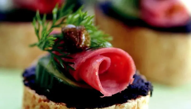 BAGET ekmeği 15 dilim halinde kesin. Üzerine zeytin ezmesi sürüp, dilimlenmiş salatalık yerleştirin. Rulo yapılmış salam dilimini kürdanla ekmeğe batırın. Üzerine kapari yerleştirin. Diğer ekmek dilimlerini de aynı şekilde hazırlayın. Dereotu ile süsleyerek servis yapın.