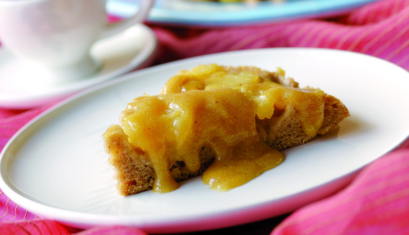Un, kabartma tozu ve tarçını harmanlayın. Soğuyan şurubu unlu karışıma yavaş yavaş ekleyip karıştırın. Mikserle çırpın. Ananası soyup küp doğrayın. 20-22 cm'lik yuvarlak bir kalıbı yağlı kağıt ile kaplayın. Ananas parçalarını yağlı kağıdın üzerine dizin. Üzerine ananas sostan 4 yemek kaşığı gezdirin ve hamuru yayın.
