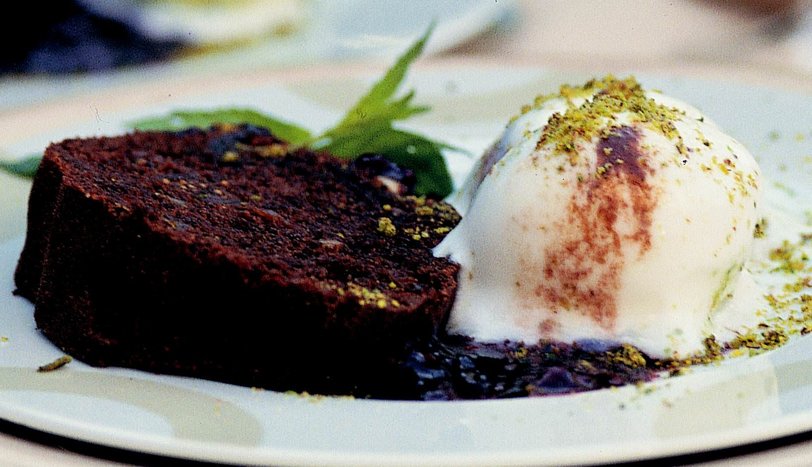 Kakaolu toz karışımı ekleyip tahta kaşıkla iyice karıştırın. Son olarak eritilmiş çikolatayı ekleyip karıştırın. Yağlanmış kek kalıbının içine karışımın 1/3'ünü boşaltın. Doğranmış kuru meyveleri ve dövülmüş ceviz içini gelişigüzel serpiştirin. Kalan karışımı kalıba boşaltın. Önceden ısıtılmış 170 derece fırında 50-60 dakika pişirin. Sos için böğürtleni ve pudra şekerini mikserleyin. Böğürtlen sos ve dondurmayla birlikte servis yapın.