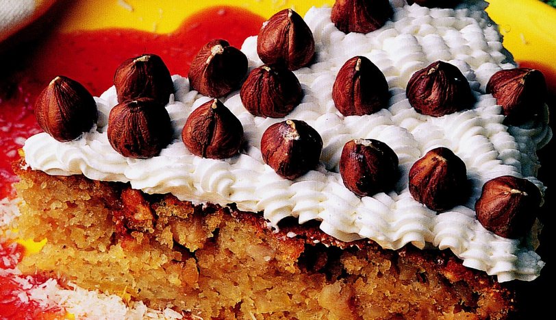 Önceden ısıtılmış 200 derece fırında 40 dakika pişirin. Soğutup servis tabağına alın. Krem şanti'yi soğuk sütle çırpın. Bir krema torbasına doldurup kekin üzerine sıkın. Fındıkla süsleyerek servis yapın.