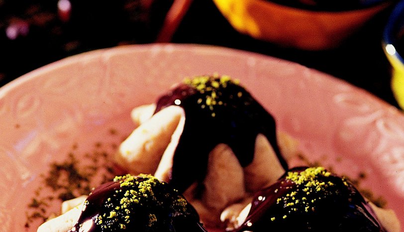 Sos için, sos malzemesini tencereye alıp, pişirin. Buzdolabından aldığınız kestane püresini ters çevirip, çıkarın ve küçük keklerin üzerine yerleştirin. Üzerine çikolatalı sos gezdirin. Antep fıstığı ile süsleyip, servis yapın.