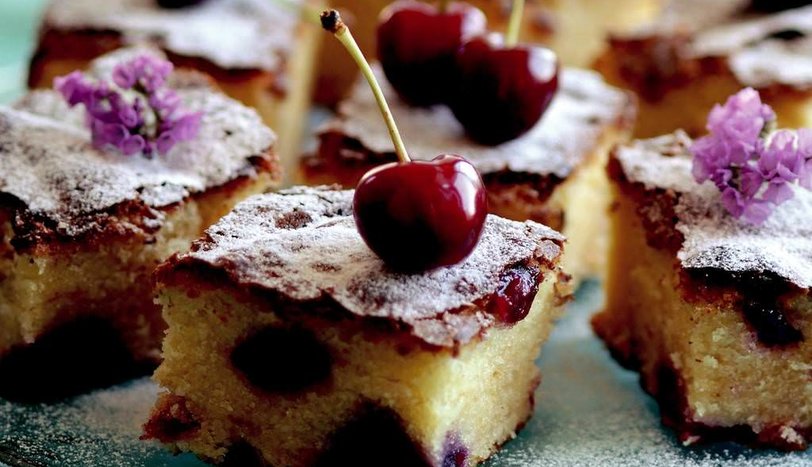 Üzerine çekirdekleri çıkarılmış kirazları serpiştirip, önceden ısıtılmış 190 derece fırında kontrol ederek pişirin. Dilimleyip, dilediğiniz şekilde süsleyerek servis yapın.