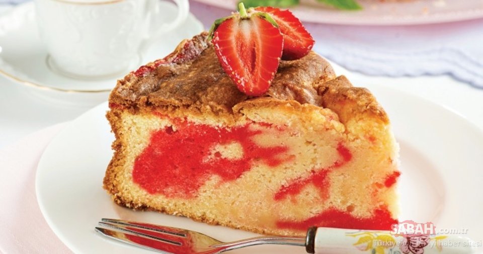 Karışımın yarısını 24 cm çapındaki bir kek kalıbına boşaltın. Ortasına çilek püresini yayın ve kalan karışımı üzerine boşaltın. Spatula ile üzerini düzelttikten sonra, önceden ısıtılmış 175 derece fırında kontrol ederek (pişip pişmediğini anlamak için keke bir kürdan batırın, kürdan temiz çıkıyorsa pişmiş demektir) pişirin. Dilimleyerek servis yapın.
