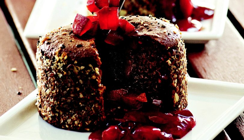 Yumurta sarısı, un ve çekirdekleri ayıklanıp kıyılmış mürdüm eriği ilave edip karıştırın. Yumurta akını çikolatalı karışıma ekleyin. Porsiyonluk kek kalıplarına pay edip, önceden ısıtılmış 200 derece fırında 7 dakika pişirin.