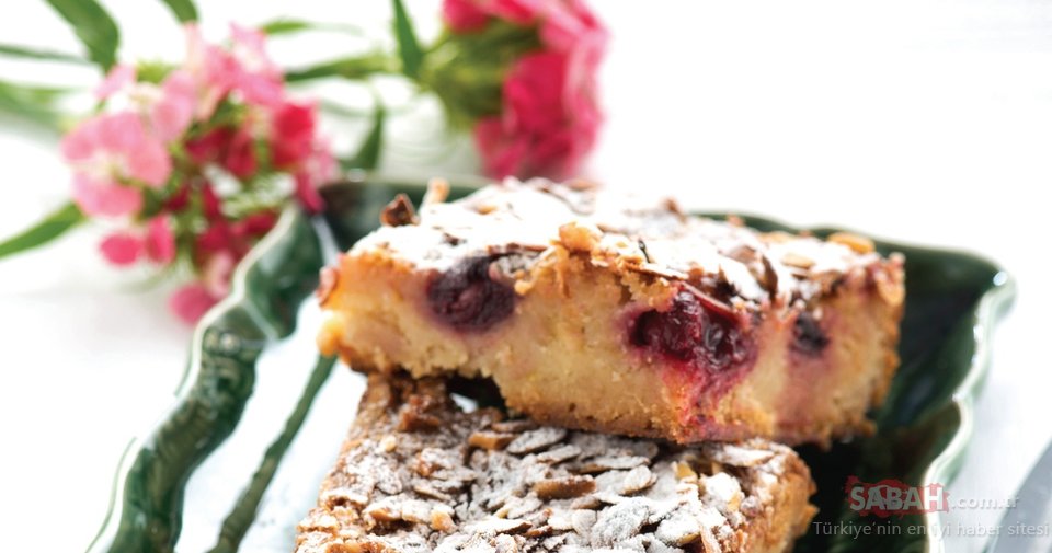 Son olarak muzlu sosu ekleyin. Karışımı yağlı kağıt ile kaplanmış 20x28 cm ebadındaki dikdörtgen bir kalıba yayın. Aralıklarla vişneleri dizin. Son olarak file bademi serpip önceden ısıtılmış 180 derece fırında 35-40 dakika pişirin (kekin pişip pişmediğini anlamak için kürdan batırın. Kürdan bu süre sonunda ıslak çıkabilir. Kek bekleyince kendini toparlayıp sertleşecektir).