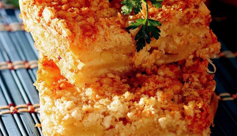 Ekmekleri robotta çekip kaşar peynirini karıştırın. Birazını patateslerin üzerine serpin. İşlemi aynı sıra ile patatesler ve ekmekli karışım bitene kadar sürdürün. Daha sonra üzerine elinizle sertçe bastırın.