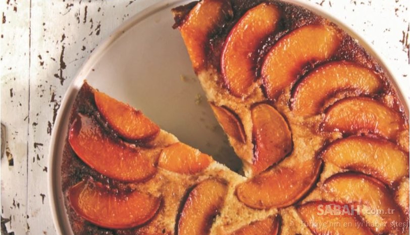 Üzeri için esmer şeker, tereyağı ve suyu bir tavaya alıp kaynatmadan kontrollü bir şekilde ısıtın. Pişirme kağıdı serdiğiniz 26 cm çapında kelepçeli bir kalıbın tabanına yarım ay şeklinde dilimlediğiniz şeftalileri dizin. Şeker iyice eridikten sonra, hazırladığınız karışımı şeftalilerin üzerine gezdirin.