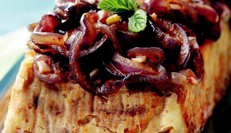 Diğer taraftan üzeri için, kırmızı soğanı soyup halka doğrayın. Tereyağını eritip soğanı kısık ateşte kavurun. Üzerine tuz, karabiber ve pul biber ekleyin. Pişen keki ters çevirip servis tabağına alın. Üzerine kavrulmuş kırmızı soğanı yerleştirin. Dilimleyerek servis yapın.