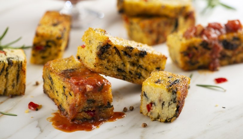 Sürenin sonunda polentayı dikdörtgen olacak şekilde dilimleyin. Pişirme kağıdı ile kaplanmış fırın tepsisine yerleştirin.
