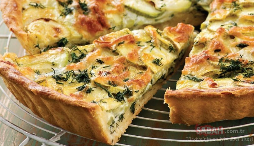 Orta boy yuvarlak bir tart kalıbına kenarlarını da kaplayacak şekilde hamuru incecik yayın. Ayrı bir yerde kaşar peynirinin ve kremanın yarısını karıştırıp, hamurun üzerine yayın. Daha sonra kabuklarıyla birlikte halka dilimlenmiş kabakları dizip, kıyılmış dereotu serpin. 1 adet yumurta, 1 adet yumurta akı ve kalan kremayı karıştırın.