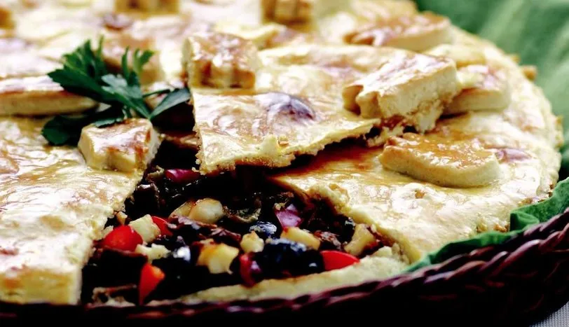 Un hariç tüm hamur malzemesini derin bir kaba alıp karıştırın. Üzerine azar azar un ekleyerek kulak memesi kıvamında bir hamur elde edene dek yoğurun. Serin bir yerde 15 dakika dinlendirin. Hamurun yarısını 25-30 cm çapındaki tart kalıbına elinizle yayın.Üzerine iç harcındaki malzemeleri sırasıyla yerleştirin. Kalan hamuru kabınızın büyüklüğünde açıp üzerine kapatın. Kürdanla ortasından delik açın. Önceden ısıtılmış 180 derece fırında 45 dakika pişirin.