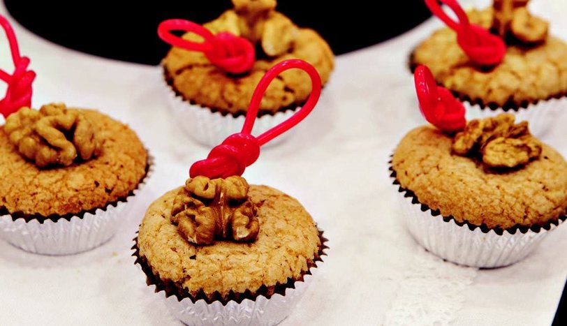 Hamurdan ceviz iriliğinde parçalar koparıp, elinizde yuvarlayın. Üzerlerine ip geçirmek için delikler açıp, üzerine yarım ceviz yerleştirin. Önceden ısıtılmış 180 derece fırında 10-12 dakika pişirin. Deliklerden ip geçirip, ılık veya soğuk olarak servis yapın.