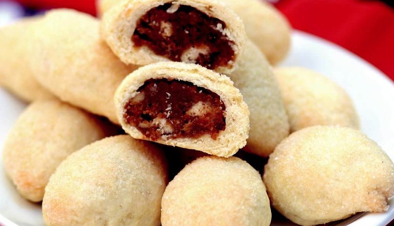 Unu ekleyin ve kulak memesi yumuşaklığında hamur elde edene kadar yoğurun. Ceviz büyüklüğünde parçalar koparın. Her parçayı 3 mm kalınlığında, yuvarlak şekilde açın. İçine cevizli iç harçtan koyun ve elips şekli verin. Diğer hamurları da aynı şekilde hazırlayın. Kurabiyelerin üst kısımlarını toz şekere batırın ve fırın tepsisine dizin. Önceden ısıtılmış 160 derece fırında 15 dakika pişirin. Ilık servis yapın.