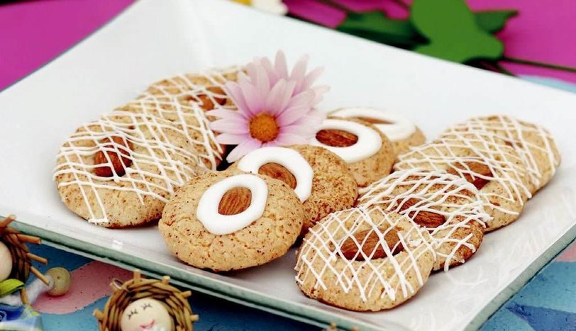 Hamurdan krema torbasına doldurup, yağlı kağıdın üzerine şekiller çıkarın. Üzerlerine birer badem yerleştirin. 160 derecede ısıtılmış fırında, 15-20 dakika pişirin. Daha sonra yağlı kağıdı ters çevirip, ıslatın. Böylece kurabiyeler kağıttan kolayca ayrılacaklardır.
