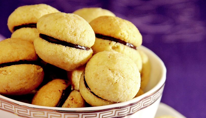 Fırın tepsisinin içine yağlı kağıt serin ve küçük topları yerleştirin. Önceden ısıtılmış 175 derece fırında 15 dakika pişirin. Diğer taraftan bitter çikolatayı benmari usulü eritin. Soğumuş iki top kurabiyenin arasına çikolatadan sürüp, birbirine yapıştırın. Top kurabiyeler ve çikolata bitene kadar işleme devam edip servis yapın.