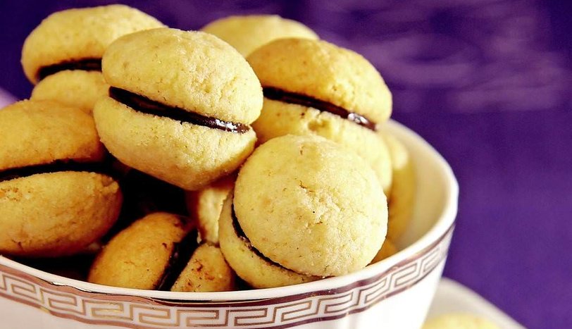 Diğer taraftan bitter çikolatayı benmari usulü eritin. Soğumuş iki top kurabiyenin arasına çikolatadan sürüp, birbirine yapıştırın. Top kurabiyeler ve çikolata bitene kadar işleme devam edip servis yapın.