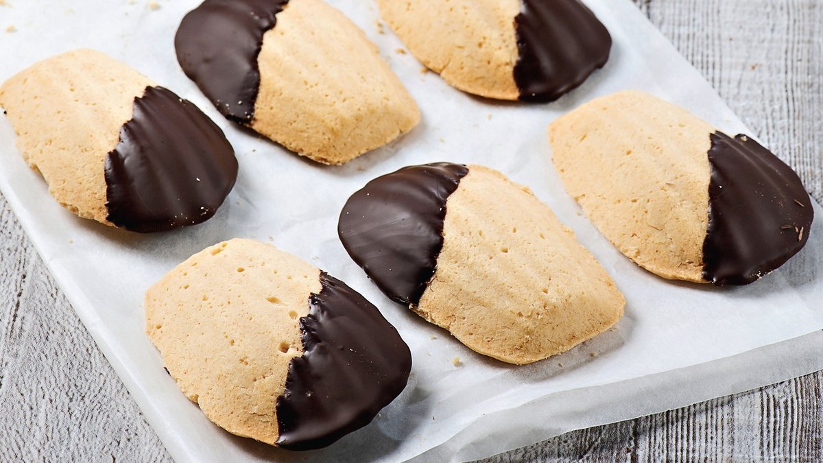 Önceden ısıtılmış 170 derece fırında hafif pembeleşene kadar pişirin ve soğumaya bırakın. Çikolatayı benmari usulü eritin ve soğuyan kurabiyelerin bir tarafını batırın. Soğutma teli üzerine alıp, çikolatanın donmasını bekleyin. Donduktan sonra servis yapın.