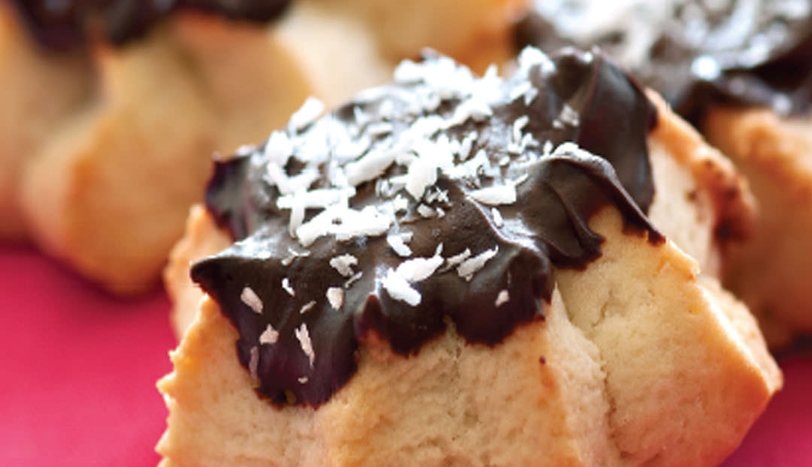 Piştikten sonra soğumaya bırakın. Çikolatayı benmari usulü eritin ve fırça yardımıyla kurabiyelerin üzerine sürün. Hindistan cevizi serptikten sonra servis yapın.AŞÇININ NOTUHazırladığınız hamuru sıkma torbasına doldurmadan, arzunuza göre de şekillendirebilirsiniz.