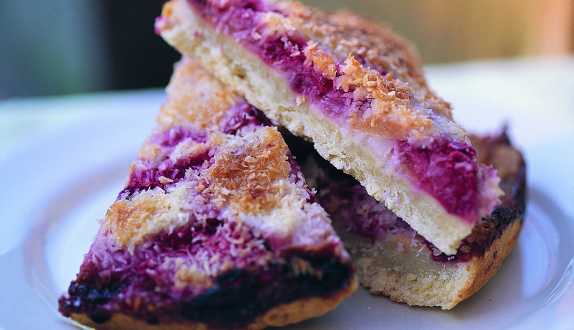 Diğer tarafta yumurta, toz şeker ve vanilyayı çırpın. Rendelenmiş hindistan cevizini ekleyip karıştırın. Karışımı meyvelerin üzerine gezdirin. Önceden ısıtılmış 160 derece fırında pişirin. Dilimleyerek servis yapın.