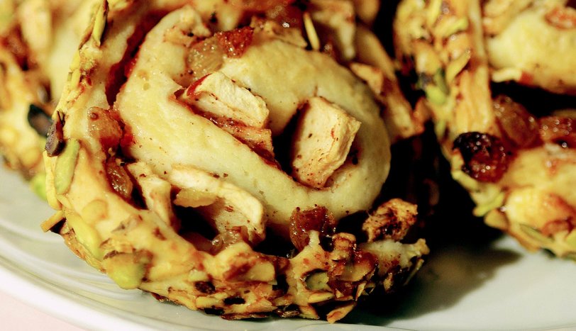 Ruloyu 2 cm kalınlığında dilimleyin. Ruloları file fıstığa bulayın. Ruloların üzerine fırçayla yumurta sarısı sürüp yağlanmış fırın tepsisine aralıklarla dizin. 15-20 dakika dinlendirin.