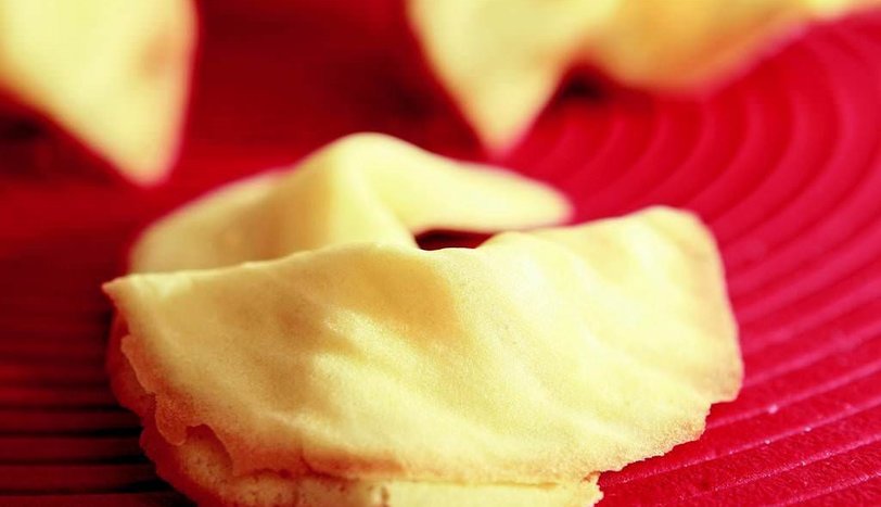 Yağlı kağıttan 8 cm çapında yuvarlaklar kesin ve fırın tepsisine yerleştirin. Yuvarlakların üzerine harçtan 1'er tatlı kaşığı döküp, düzgünce yayın. Önceden ısıtılmış 180 derece fırında 5 dakika pişirin. Fırından alır almaz kurabiyelerin içine hazırladığınız dilek kağıtlarını koyun ve bekletmeden katlayıp, şekil verin. Soğuduktan sonran servis yapın.
