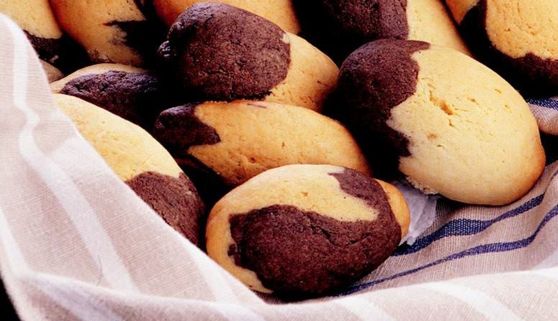 Hamuru iki eşit parçaya ayırın. Parçalardan birine kakaoyu katıp iyice yoğurun. İki çeşit hamurdan elinize iki küçük top alıp, birlikte yuvarlayın.- 3