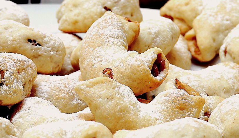 İçi için elmaları soyup rendeleyin. Toz şeker ve kuru üzümü ekleyin. Kısık ateşte hafifçe pişirin. Soğuyunca dövülmüş fındık ve tarçını ekleyip karıştırın. Unu bir kaba eleyin ve oda sıcaklığındaki margarin, yoğurt, pudra şekeri ile kabartma tozunu ekleyip yoğurun.