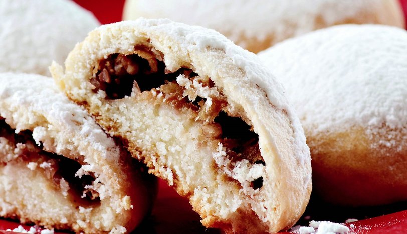 Ortasına 1 tatlı kaşığı elmalı harçtan koyun ve yuvarlayarak şekil verin. Hamur ve iç harç bitene kadar işleme devam edin. Kapattığınız taraf alta gelecek şekilde yağlanmış fırın tepsisine aralıklarla dizin. Önceden ısıtılmış 180 derece fırında 30 dakika pişirin. Soğuduktan sonra üzerine elenmiş pudra şekeri serpin.
